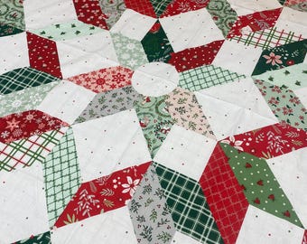 The central motif is a large, intricate star pattern composed of various smaller triangles in shades of red, green, white, and plaid, arranged in a symmetrical, eye-catching layout.