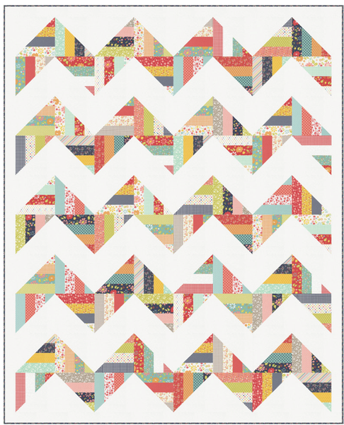 A modern take on the traditional rail fence, this quilt uses alternating strip sets and playful angles to create a bold, eye-catching design. Perfect for showing off a mix of colors and coordinating basics.