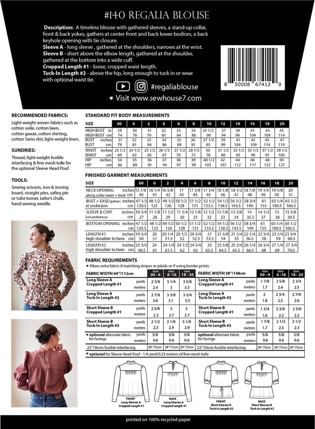A printed sewing pattern and instructions for the Regalia Blouse. A timeless blouse with gathered sleeves, a stand-up collar, front & back yokes, gathers at center front and back lower bodices, a back keyhole opening with tie closure. Sleeve A - long sleeve , gathered at the shoulders, narrows at the wrist. Sleeve B - short above the elbow length, gathered at the shoulder, gathered at the bottom into a wide cuff. Cropped Length #1 - loose, cropped waist length. Tuck-In Length #2 - above the hip, long enough to tuck in or wear with optional waist tie. Sizes 00 - 20