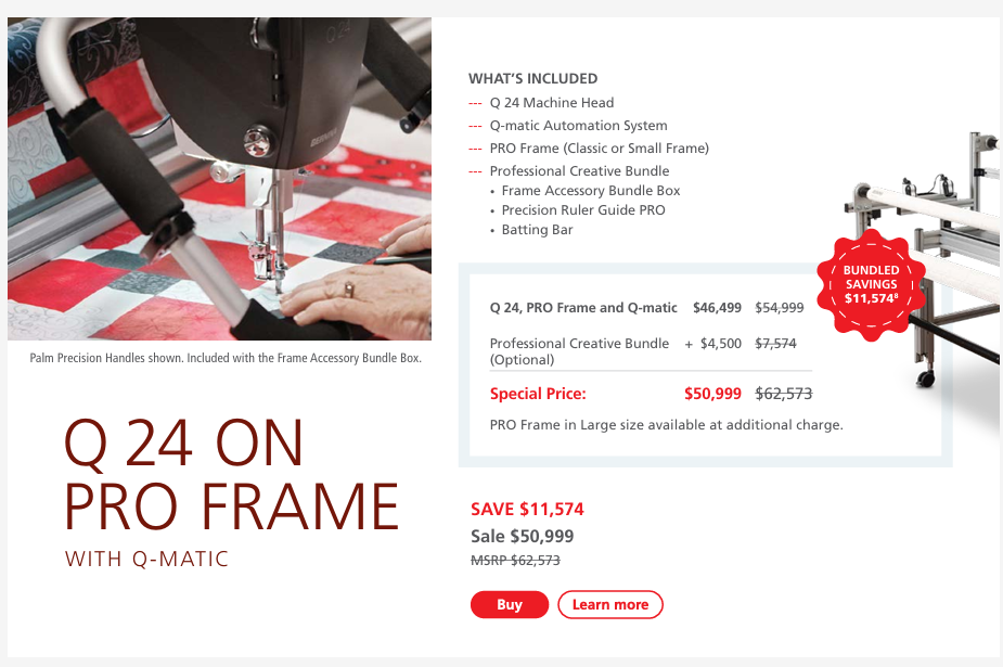 The BERNINA Q 20 frame model machine has ample room for your large quilt projects. The frame will accommodate a quilt up to 108” wide. Your choice of 10', 11' or 13' frame. with the addition of the Q-matic Software!