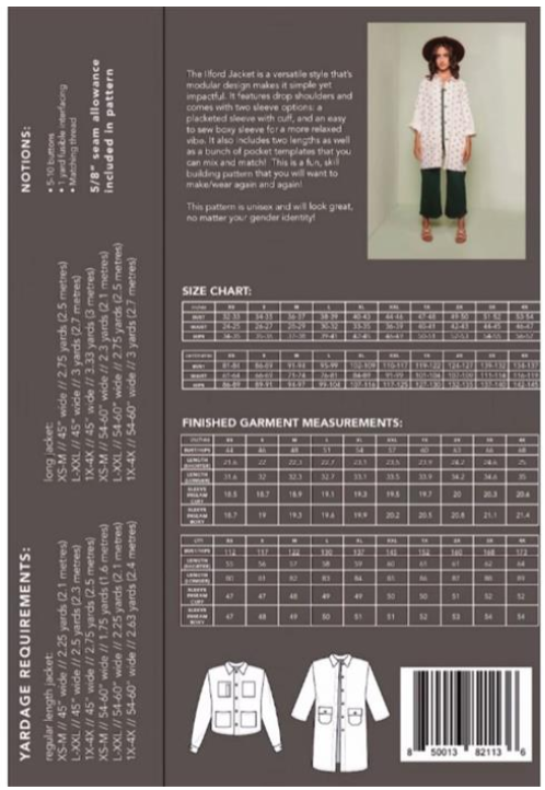 It features drop shoulders and comes with two sleeve options: a placketed sleeve with cuff, and an easy to sew boxy sleeve for a more relaxed vibe. It also includes two lengths as well as a bunch of pocket templates that you can mix and match! The possibilities are endless! You can wear the Ilford as a jacket or shirt depending on the fabric you use. This is a fun, skill building pattern that you will want to make/wear again and again! This pattern is for everyone and looks great on all genders!