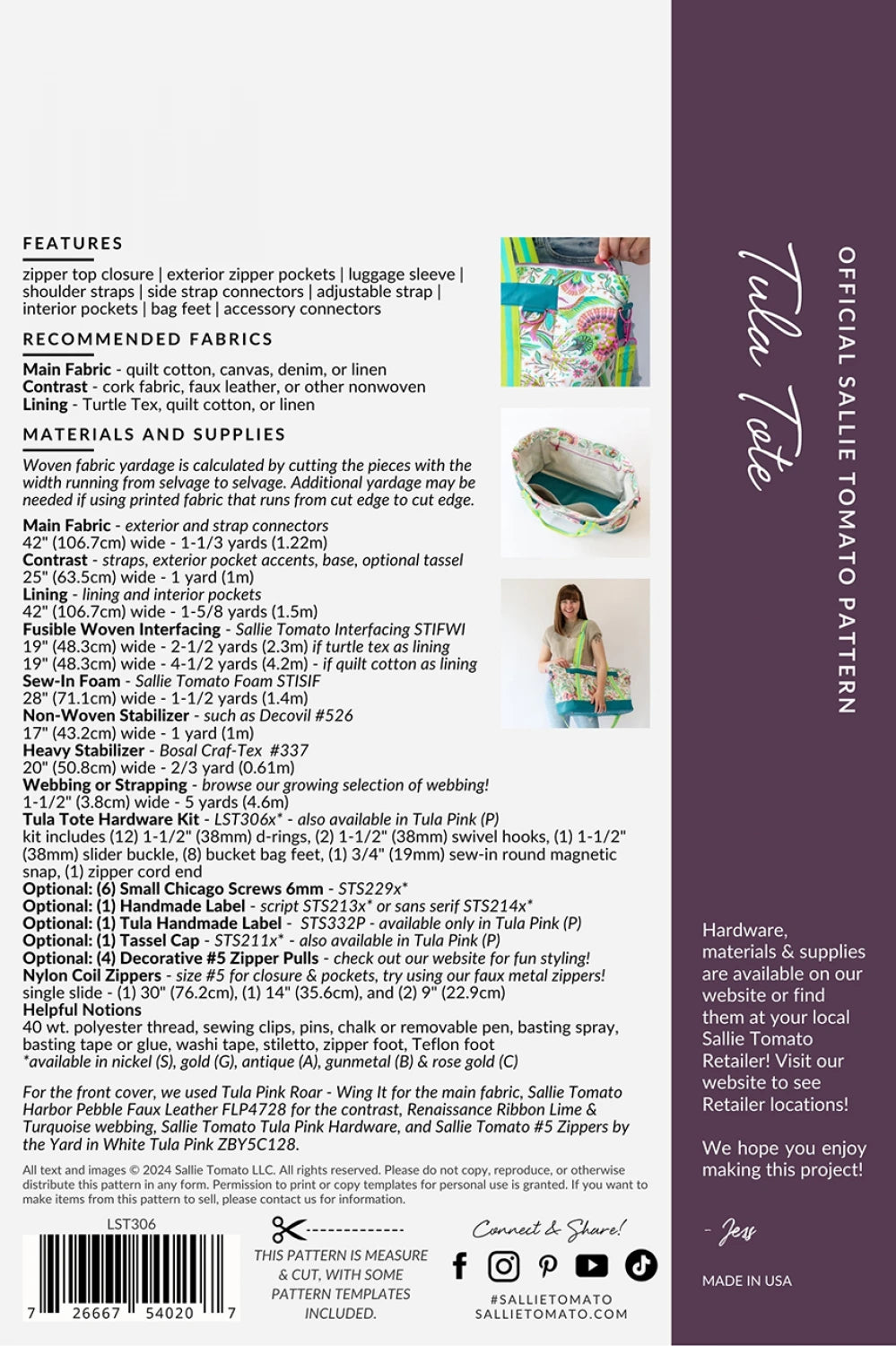 A spacious tote with multiple pockets, luggage sleeve, and d-rings for clip-on accessories by Sallie Tomato with Tula Pink. Imagine all that you could pack into the Tula Tote: an assortment of projects for a retreat, or everything you might need for a day-trip. This ultimate carry-all includes various pockets for storage, luggage handle sleeve, and plenty of d-rings for clip-on accessories to optimize your organizing!
